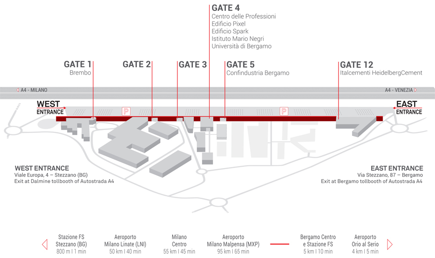 underpass just outside Bergamo, at the roundabout, turn right into Kilometro Rosso’s avenue (EAST
