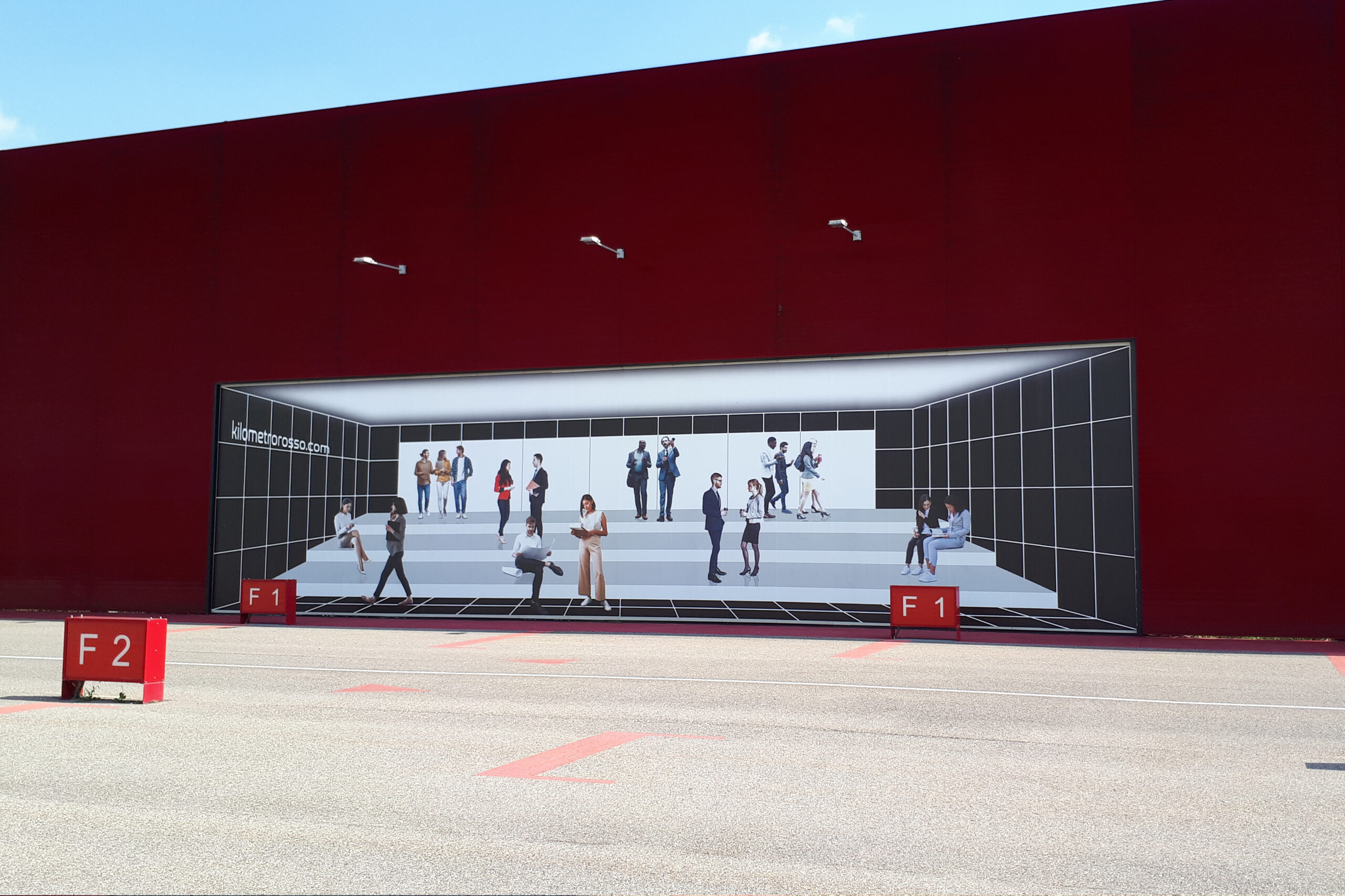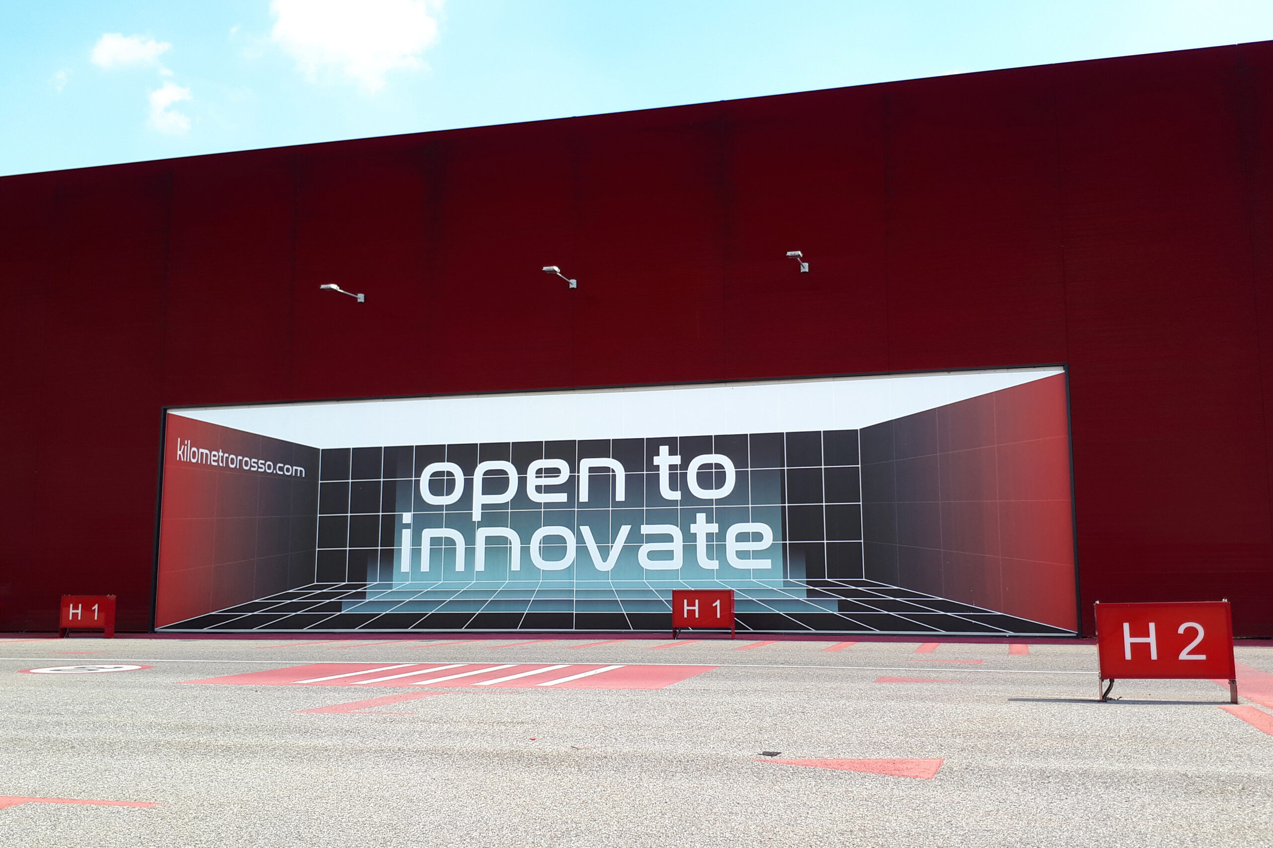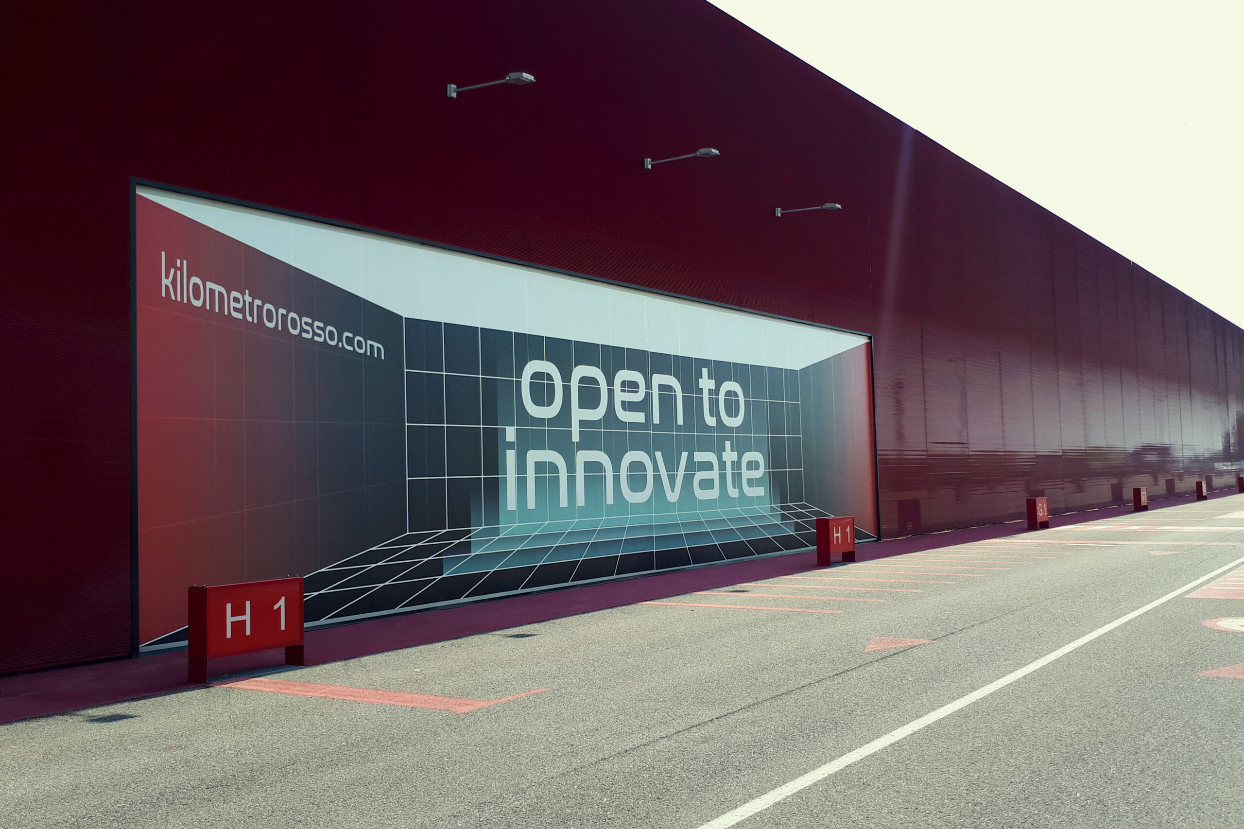 Il Kilometro Rosso è un luogo di incontro e scambio di idee, ricerche e attività imprenditoriali che generano innovazione, mettendo insieme talenti, competenze e nuove tecnologie per creare un ecosistema virtuoso. La linea rossa lungo l’autostrada che identifica il campus è una “pelle permeabile” che traspira questo spirito di innovazione condivisa. I grandi portali che scansionano il ritmo del fronte amplificano, sia metaforicamente che in maniera espressiva, l’apertura del Kilometro Rosso al territorio e allo stesso tempo offrono un’interfaccia dinamica e tangibile ai milioni di persone che ogni anno gettano lo sguardo sulla parete percorrendo la A4—attratti da questa linea forte, ma anche curiosi di vedere cosa accade al di là.