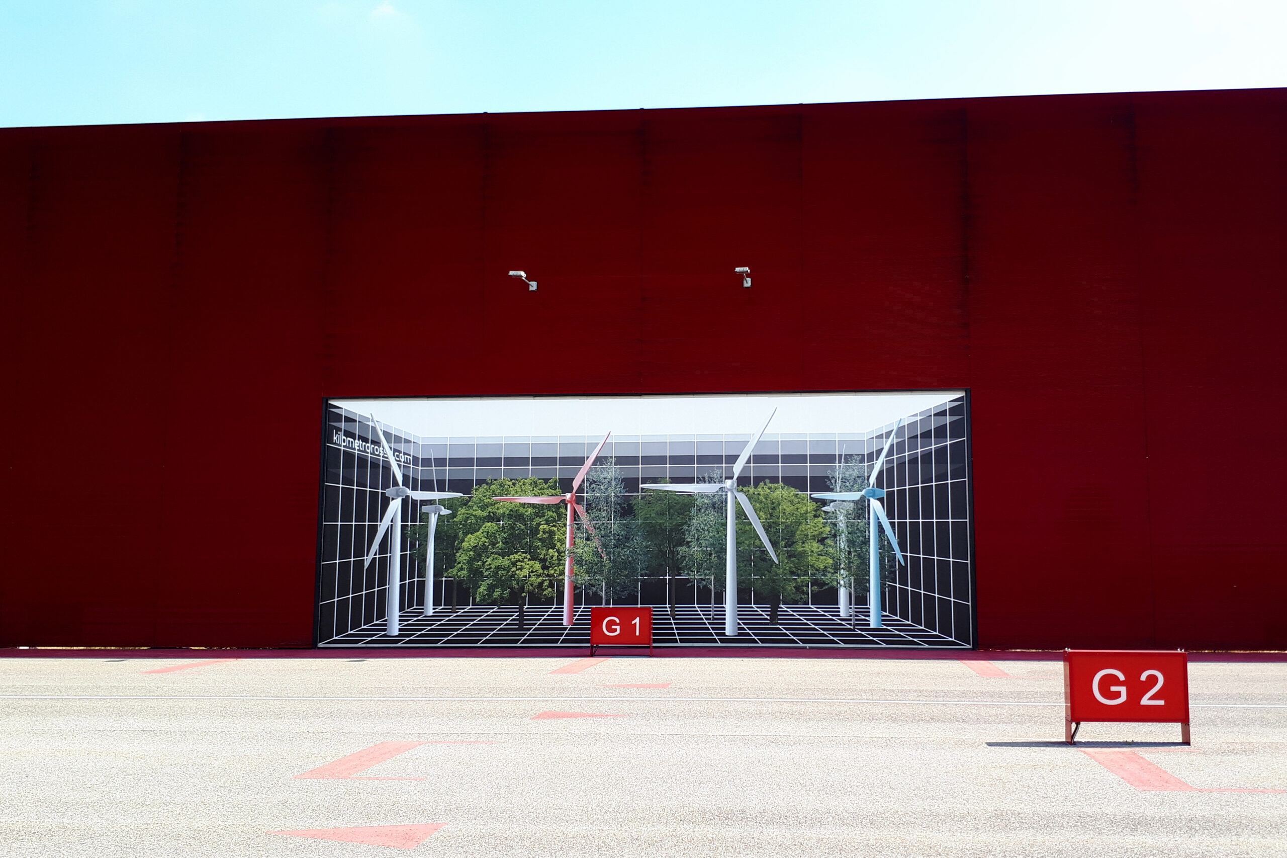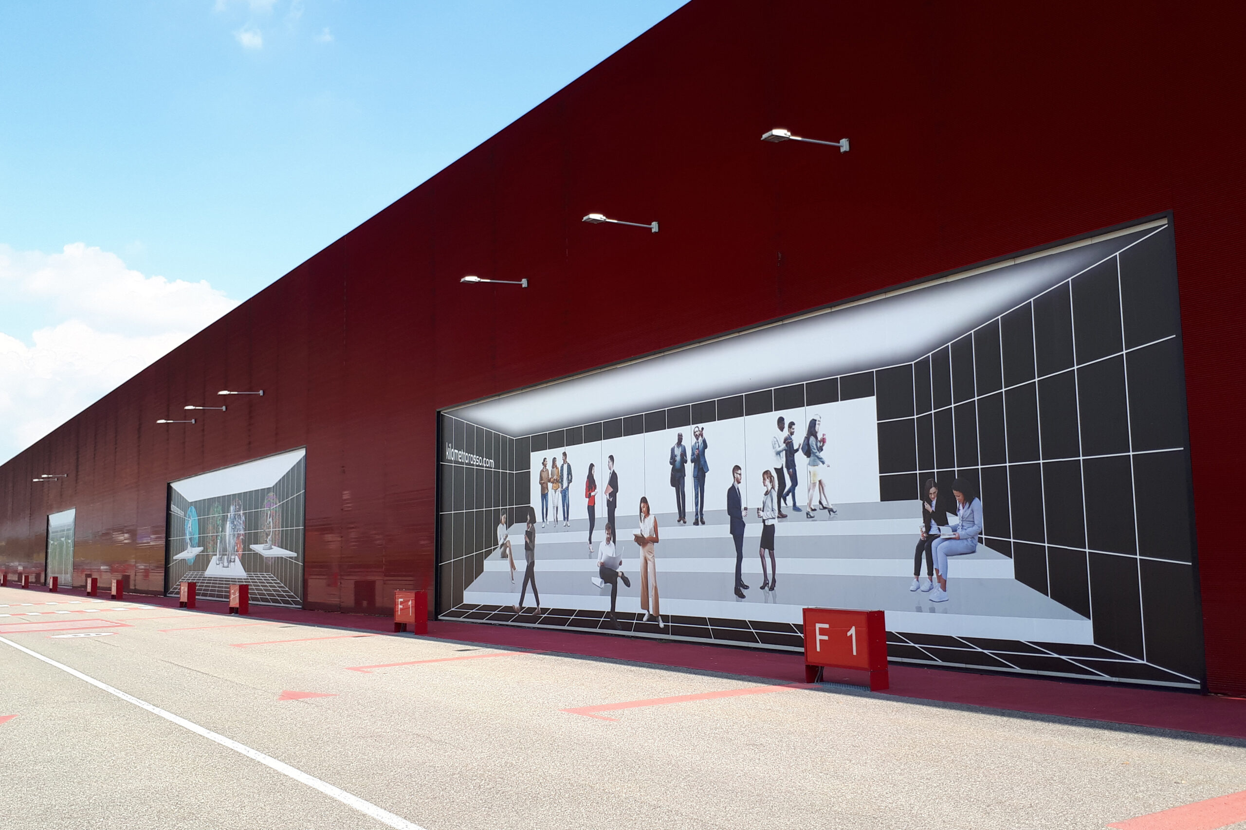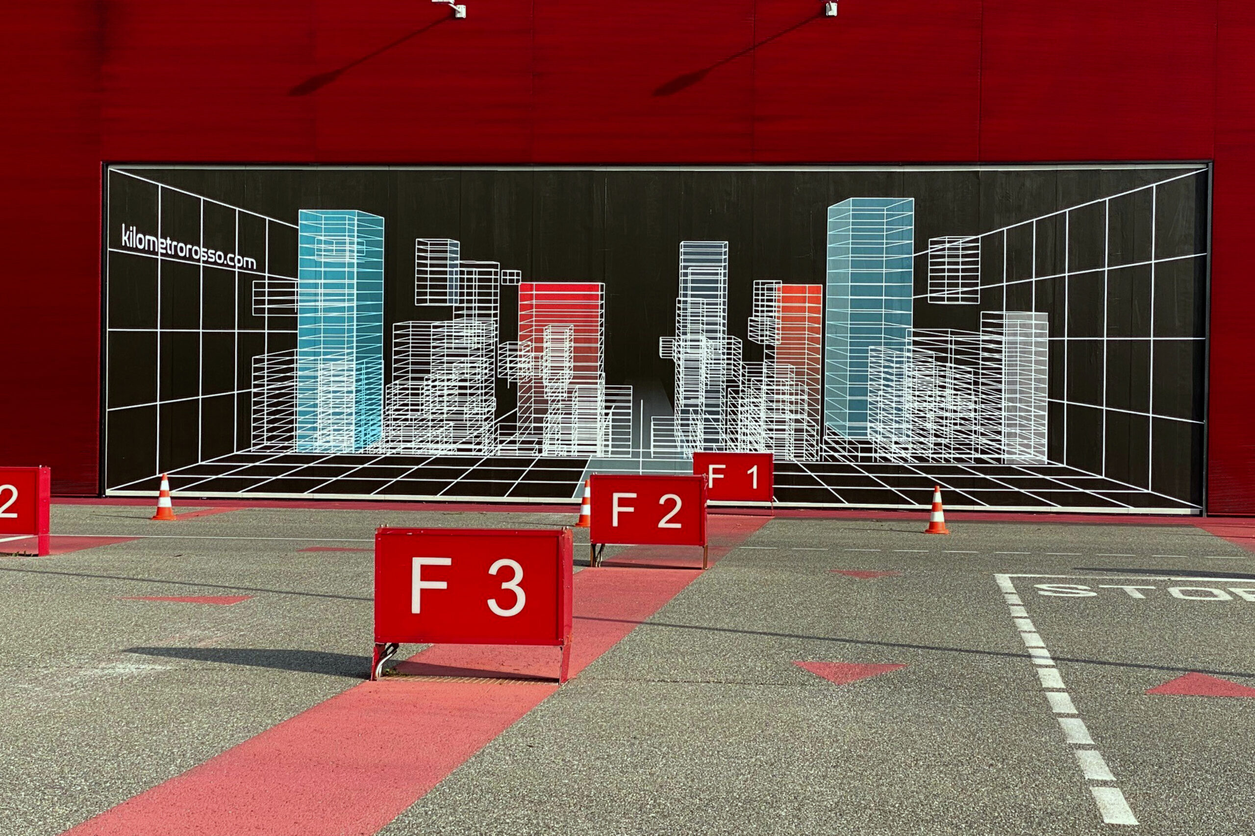 Il Kilometro Rosso è un luogo di incontro e scambio di idee, ricerche e attività imprenditoriali che generano innovazione, mettendo insieme talenti, competenze e nuove tecnologie per creare un ecosistema virtuoso. La linea rossa lungo l’autostrada che identifica il campus è una “pelle permeabile” che traspira questo spirito di innovazione condivisa. I grandi portali che scansionano il ritmo del fronte amplificano, sia metaforicamente che in maniera espressiva, l’apertura del Kilometro Rosso al territorio e allo stesso tempo offrono un’interfaccia dinamica e tangibile ai milioni di persone che ogni anno gettano lo sguardo sulla parete percorrendo la A4—attratti da questa linea forte, ma anche curiosi di vedere cosa accade al di là.