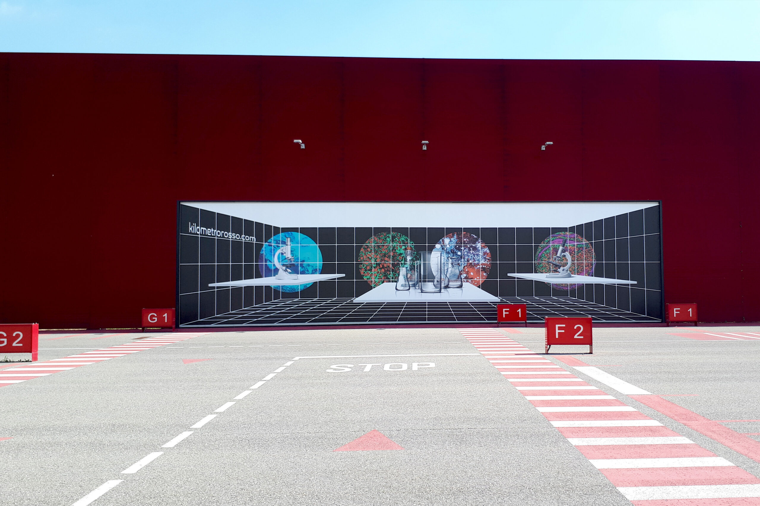 Attraverso un processo di astrazione e simulazione dello spazio dalla scala del “micro” a quella del “marco”, i nuovi portali del Kilometro Rosso, nati dal progetto grafico del nostro partner Oblyk Studio, si trasformano in dei “meta-luoghi” che svelano e suggeriscono alcune delle tematiche, dei principi e delle attività fondamentali del campus. Se il primo di questi spazi fittizi è un invito a “co-innovare”, il secondo è invece espressione del concetto di sostenibilità—enfatizzando l’attenzione all’ambiente e l’utilizzo delle energie rinnovabili. Proseguendo verso ovest, incontriamo poi il portale dedicato alla ricerca e alla scienza, seguito dallo spazio incentrato sull’esperienza e sul senso di community che caratterizza la vita delle persone che lavorano nel campus. Il quinto spazio rimanda all’idea di interazione uomo-macchina e all’utilizzo delle nuove tecnologie, come la robotica e la realtà virtuale. L’ultimo portale rompe infine le barriere prospettiche del meta-spazio tridimensionale e ci proietta verso il futuro, immersi in una città a cavallo tra il reale e il digitale—fatta di scambi di big-data ed aumentata dall’intelligenza artificiale.