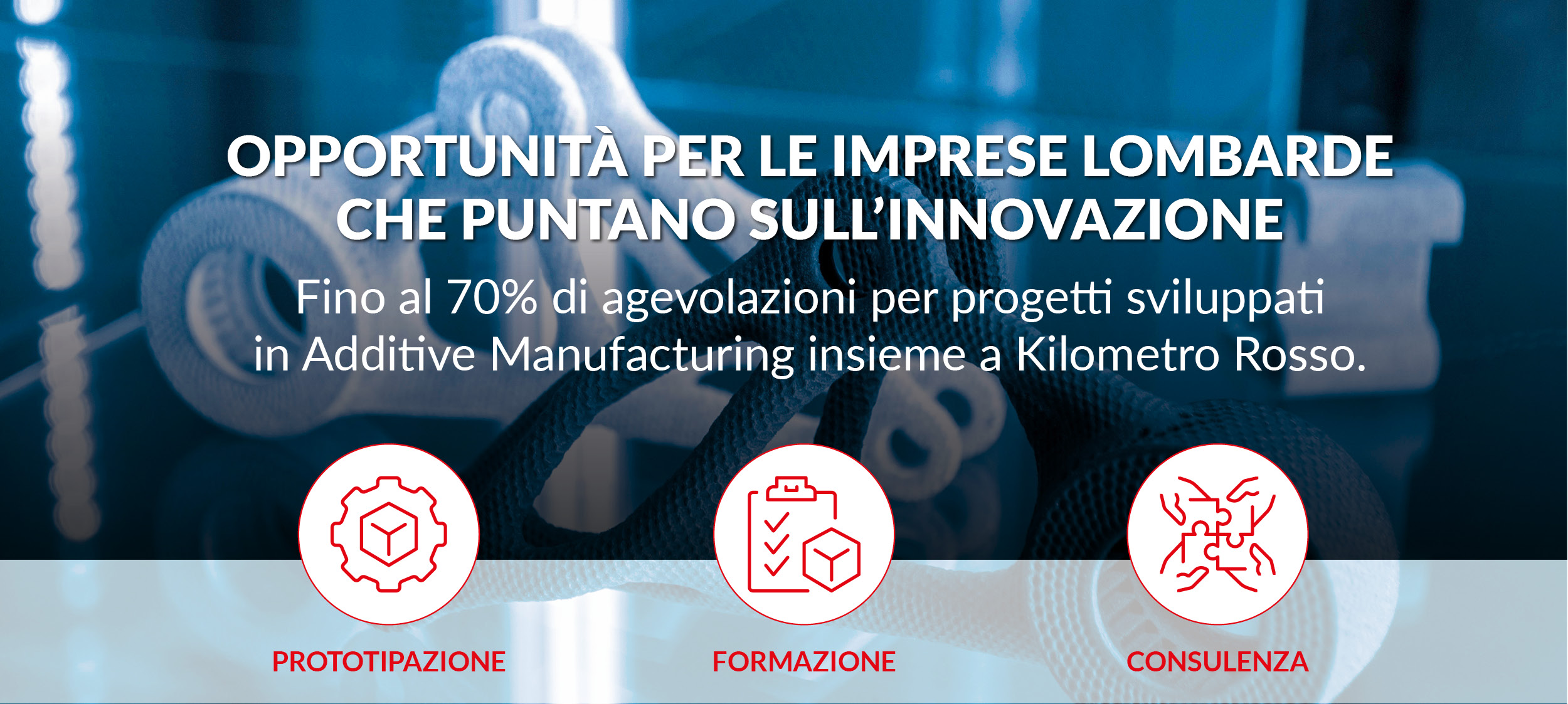 Il Parco tecnologico Kilometro Rosso può accompagnare le imprese che intendono innovare i loro processi produttivi e approfondire il tema della produzione additiva. Attraverso il laboratorio Lisa Tech, offriamo una gamma completa di servizi per guidare le imprese nel mondo dell’Additive Manufacturing, uno dei settori in più rapida espansione.