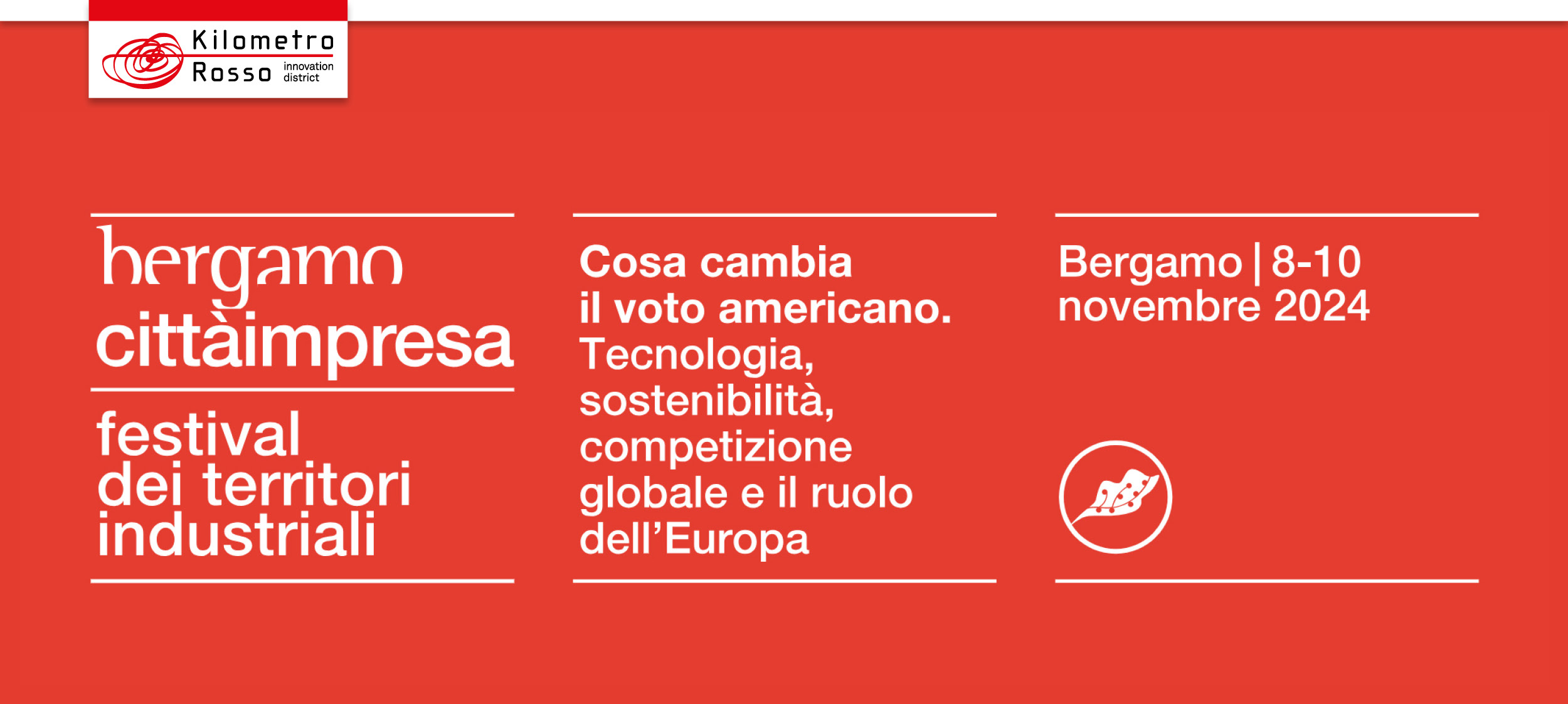 Al Festival dedicato alle imprese e ai territori industriali, non poteva mancare Kilometro Rosso, presente in una duplice veste: il Parco tecnologico è tra i partner della kermesse, e ospiterà tre importanti eventi che, nella mattinata di domenica 10 novembre, concluderanno i lavori del Festival Bergamo Città Impresa.