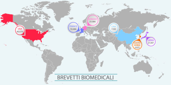 A livello mondiale invece il campo biomedicale domina la classifica dei brevetti e il primo paese per domande di brevetti sono gli Usa (40.076) anche se in flessione (-5,9% sul 2015). In seconda posizione la Germania con 25.086 brevetti (+1,1%) mentre sia Giappone (21.007, -1,9%) che Francia (10.486, -2,5%) registrano dei trend negativi.