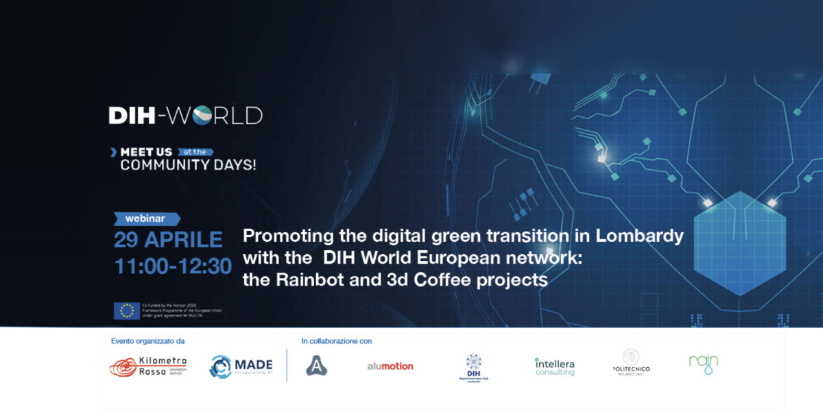 Venerdì 29 aprile dalle 11:00 alle 12:30 si terrà il webinar “Promoting the digital green transition in Lombardy with the DIH World European network: the Rainbot and 3D Coffee projects” organizzato da MADE e Kilometro Rosso, due hub innovativi italiani che -insieme ad altri quattro hub dell’innovazione-, compongono il network europeo DIH-WORLD.