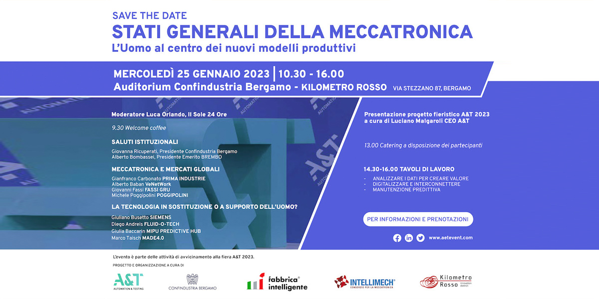 È il tema dell’evento in programma mercoledì 25 gennaio presso il nostro campus (Auditorium di Confindustria Bergamo, Gate 5), dal titolo “Stati Generali della Meccatronica – L’uomo al centro dei nuovi modelli produttivi”, organizzato da A&T in collaborazione con Confindustria Bergamo, Fabbrica Intelligente, Consorzio Intellimech e Kilometro Rosso.