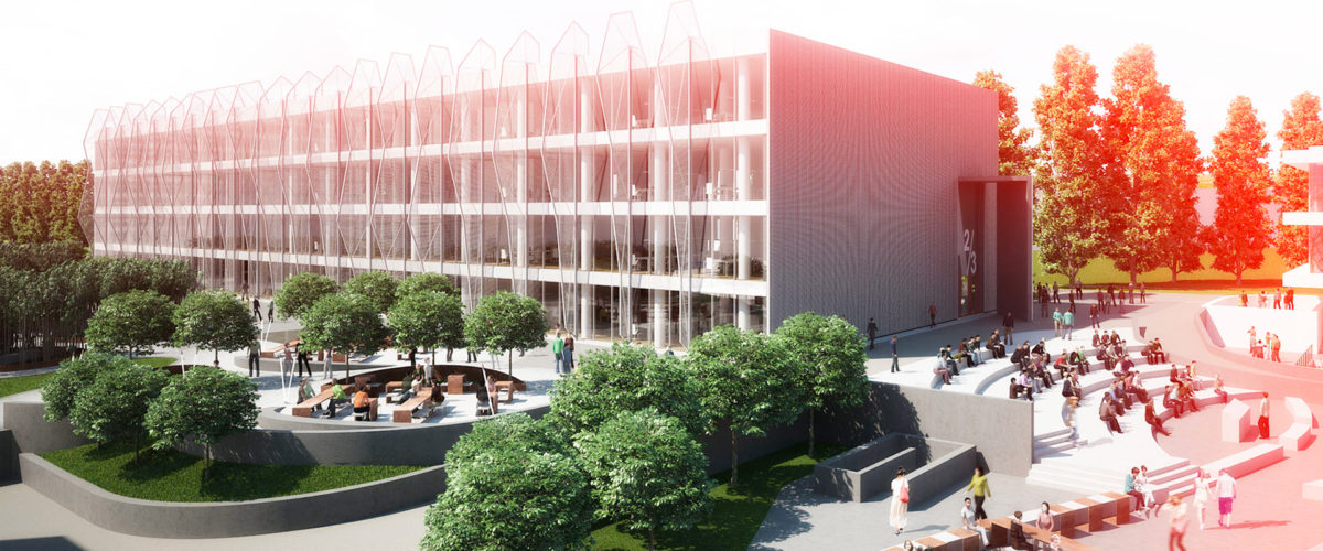 Questi espedienti sono stati adottati, da una parte, per rendere ambiguo un edificio che per ragioni di economicità e sostenibilità energetica è riconducibile al volume semplificato del parallelepipedo e, dall’altra, per permettergli di dialoga con i principi di «trasparenza e vibrazione» che caratterizzano il Parco Scientifico Tecnologico disegnato da Jean Nouvel.