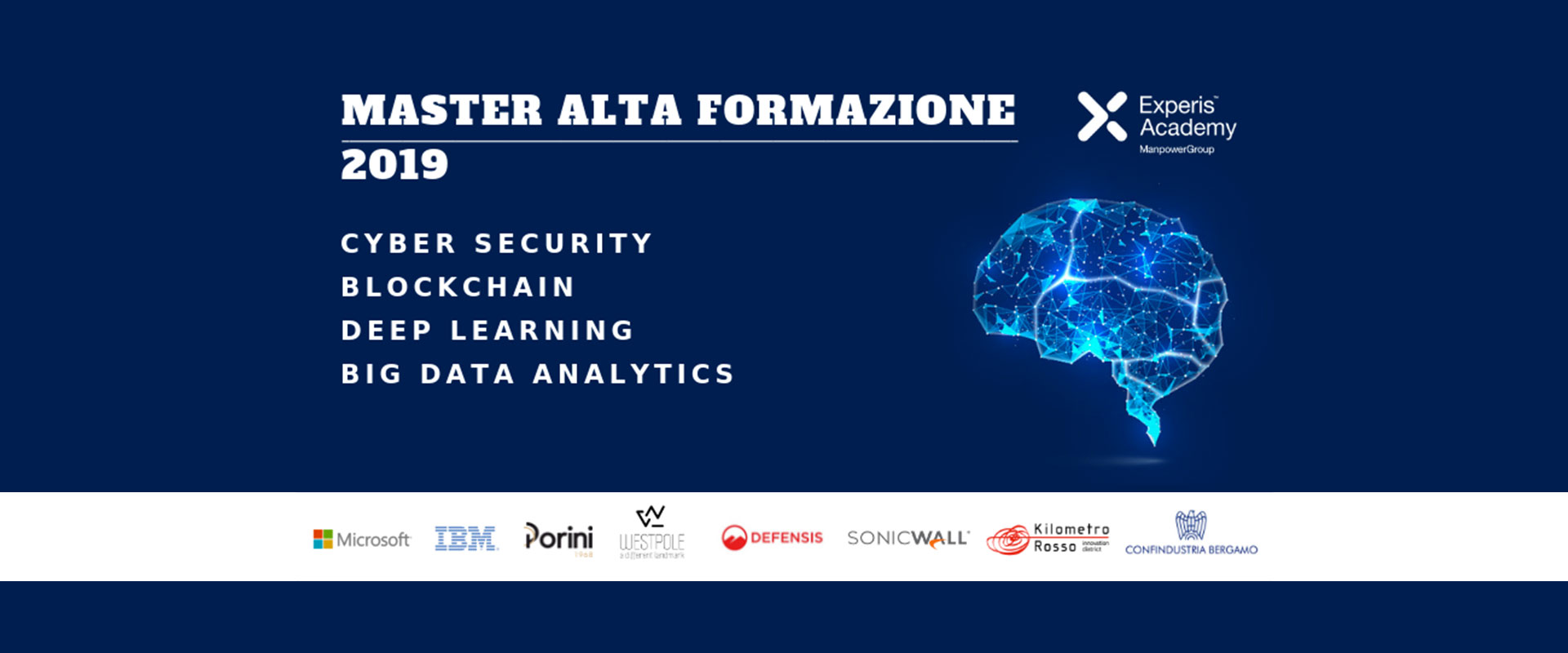 I master in partenza ad Aprile 2019 saranno dedicati a BLOCKCHAINDEEP LEARNING, BIG DATA ANALYTICS e CYBER SECURITY. Quest’anno la direzione didattica e le docenze saranno affidate a grandi aziende del calibro di Microsoft, IBMWestpole e P4I e molte altre le quali, in qualità di Partner, partecipano attivamente al processo di creazione delle competenze del candidato.