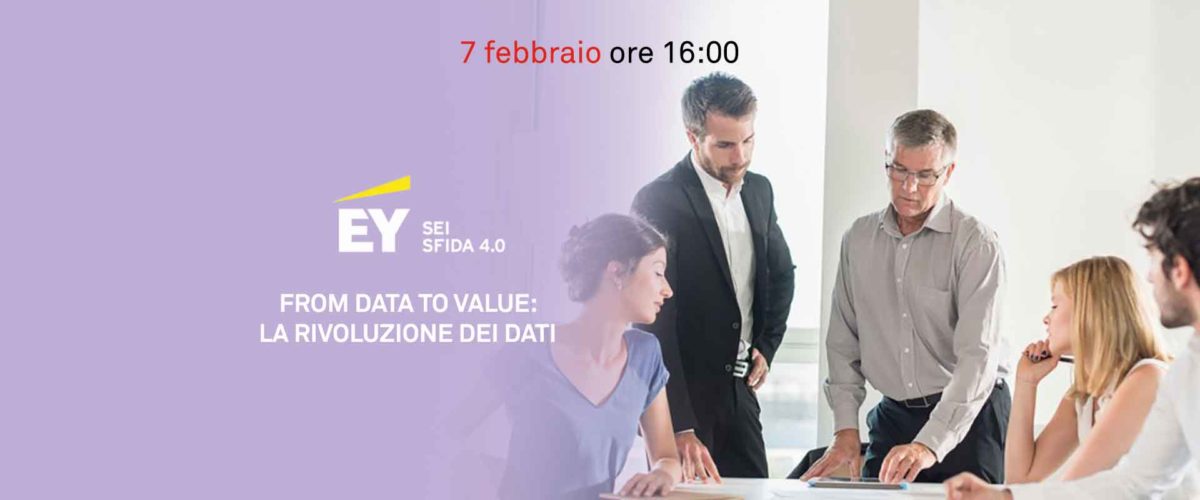 Il 7 febbraio alle h. 16:00 si svolgerà l’incontro “From data to value: la rivoluzione dei dati”, il quarto appuntamento della serie di workshop “Dalla Strategia al Controllo”, organizzati da Sfida Italia 4.0 e SEI Consulting, società di consulenza entrata recentemente a far parte del network internazionale EY.